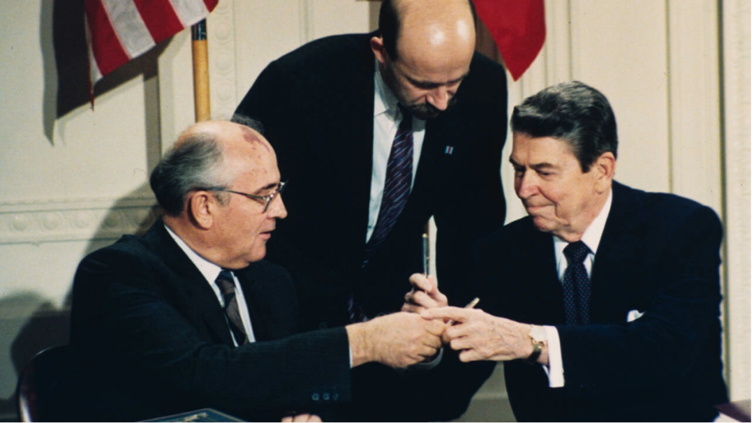 图:1987 年戈尔巴乔夫与里根签署文件后交换签字笔